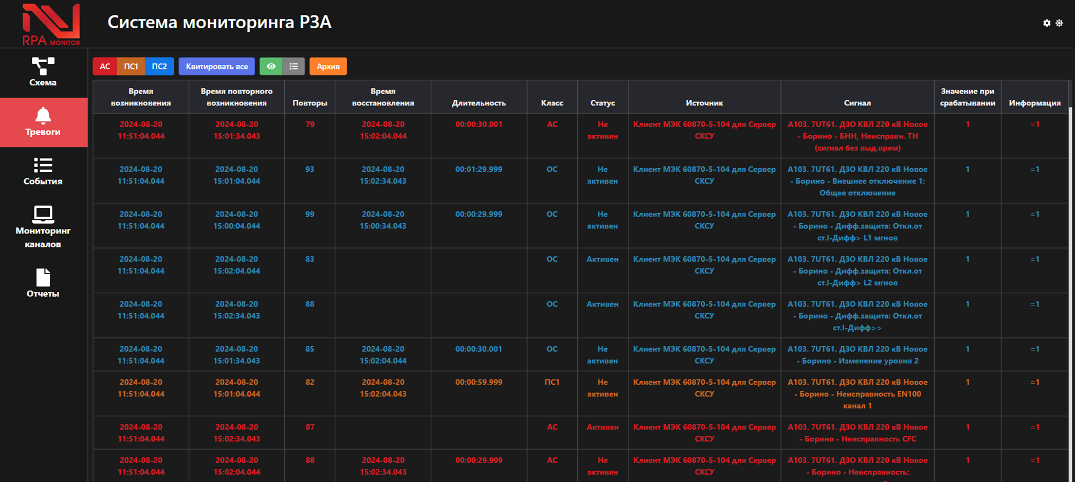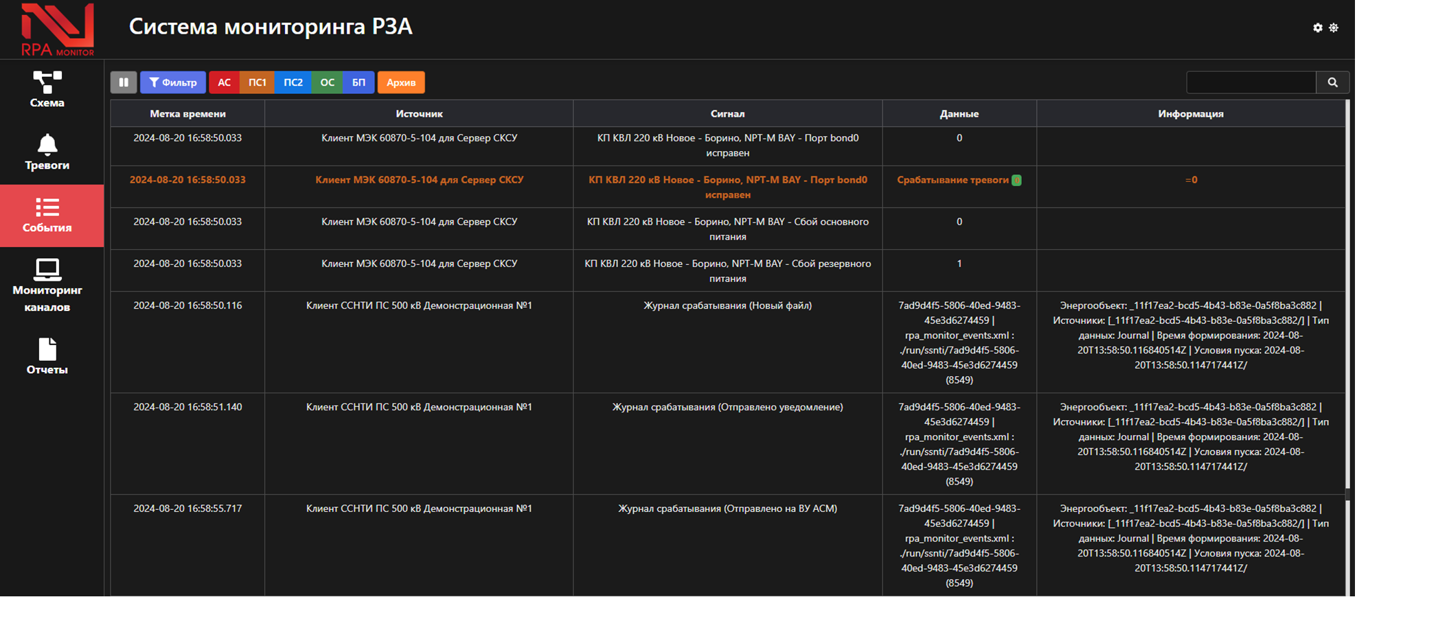 - классификация событий мониторинга устройств РЗА, АСУ ТП и СИ по группам тревог и ведение журнала тревог;
